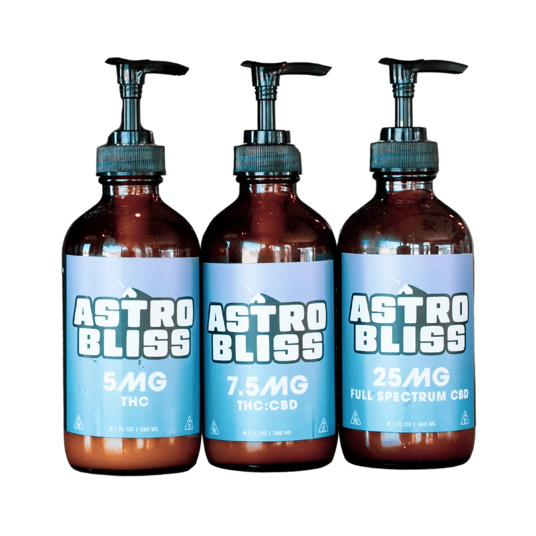 AstroBliss THC pump bottles offer a fast, effective way to enhance your relaxation. Designed for ultimate convenience, each pump delivers a precise dose of water-soluble THC or CBD, letting you customize your experience.